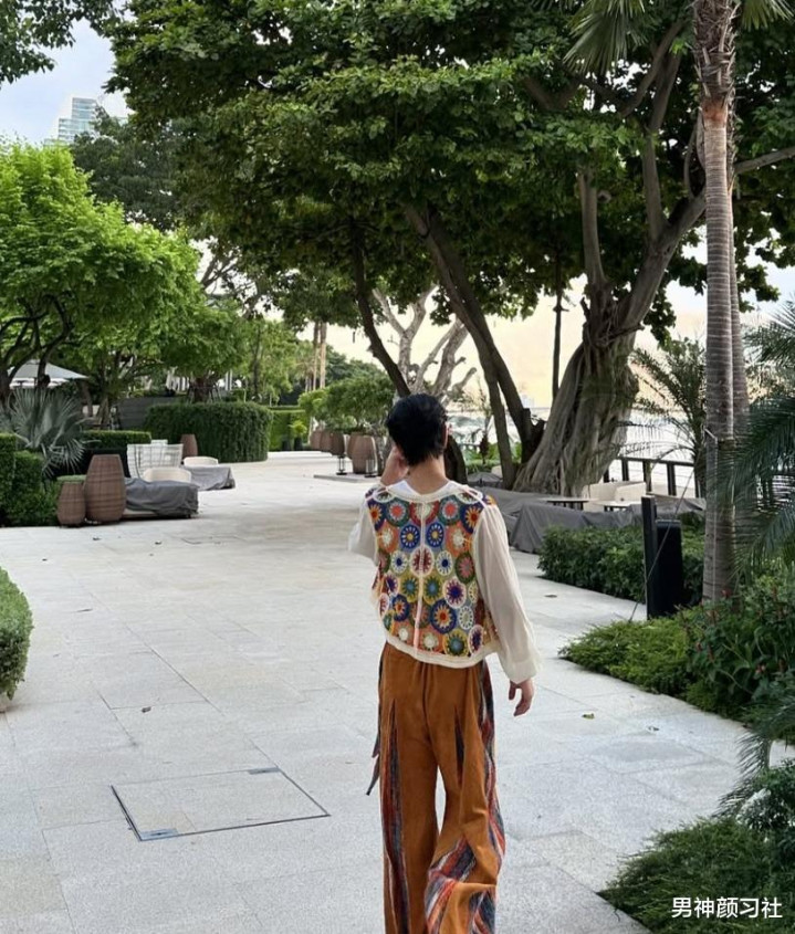 这条裤子比较偏波西米亚风,所以在搭配上全身的风格也要一致。他就选了一件同样是波西米亚风的上衣,这样的话就比较和谐,在人群中也很有存在感。