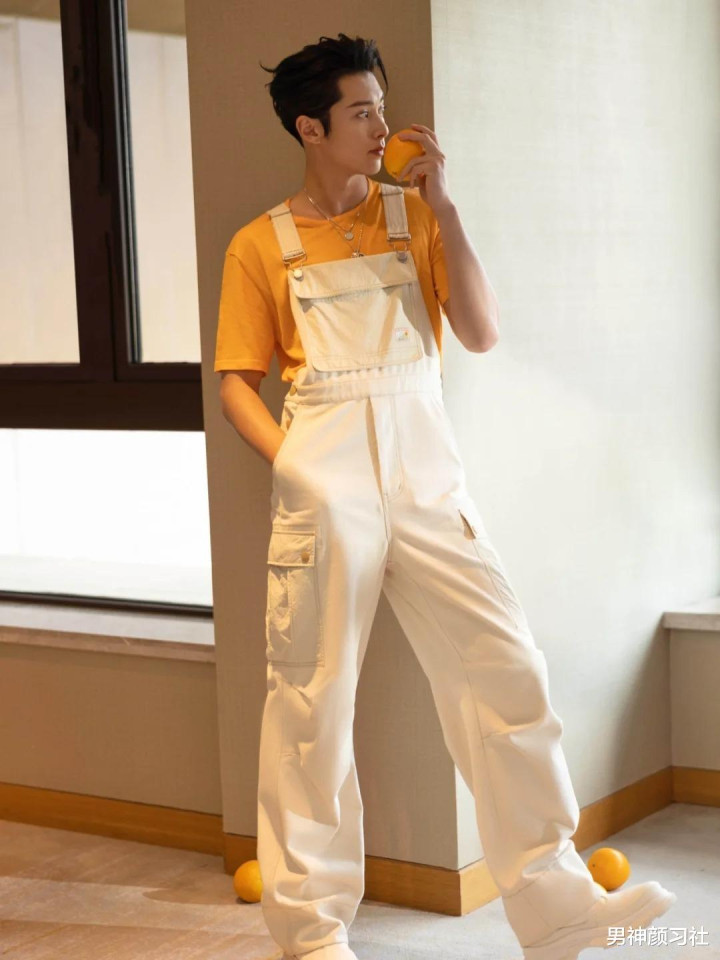 除了蓝色的之外,白色的更加好搭配一些。王鹤棣之前穿的白色背带裤,就还蛮能凸显他的身姿。他也是用了一件橙色短袖,让look更有活力一些。如果你不是特别高的男生,也可以像他这样穿上一双厚底鞋。